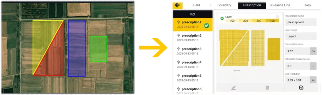 5. 精准农业:可以制作、导入处方并将处方随任务下发至终端,终端实时上报施用情况并在FMS系统上生成报告,通过精准的农艺作业减少资源消耗。